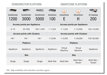 of our customers. The ZoneDirector software platform delivers a rich WiFi feature set. It best addresses the needs of small to medium on-premise WiFi deployments. The SmartZone software platform provides carrier-class performance, form factor flexibility, and high-performance WiFi that can scale as an enterprise or a service provider grows.